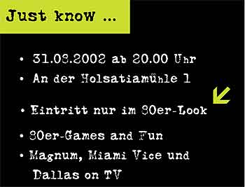 NEWSFLASH (klick it!) 28.08.2002 - Fehler im Wunschhit-Mail-Link behoben. Bitte alle Wünsche neu abgeben :-/ 28.08.2002 - Das Getränkeprogramm ist fertig gestellt 28.08.2002 - Das Essensprogramm ist fertig gestellt (geheim) 29.08.2002 - Die ersten Songwünsche trudeln ein und werden ausgewertet - 29.08.2002 Die Anfahrt-Route ist online! - 29.08.2002 Die Fotostory zum Einigungsprozess ist online -